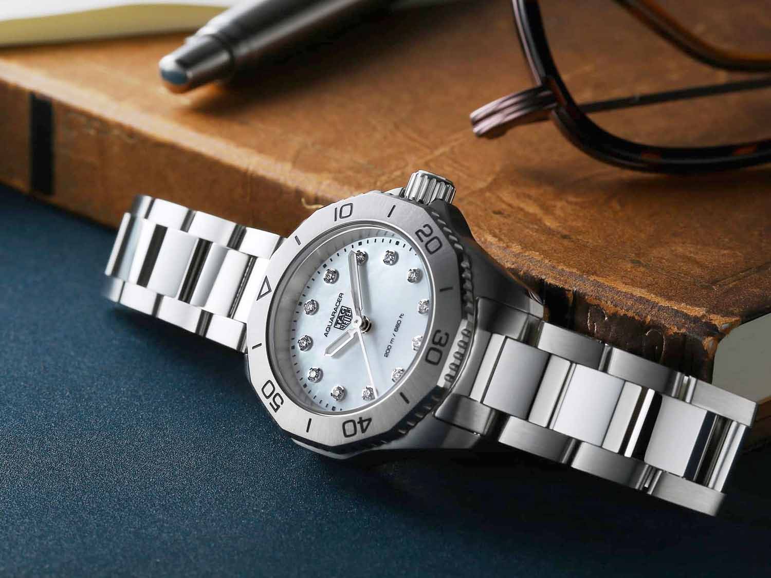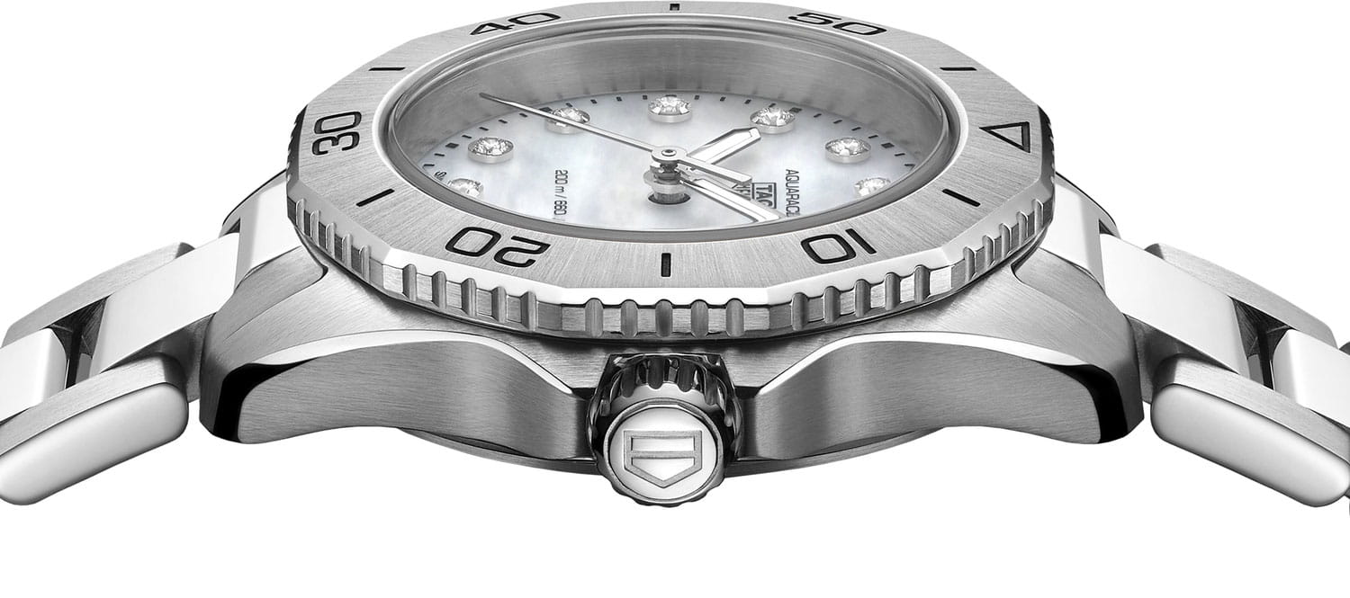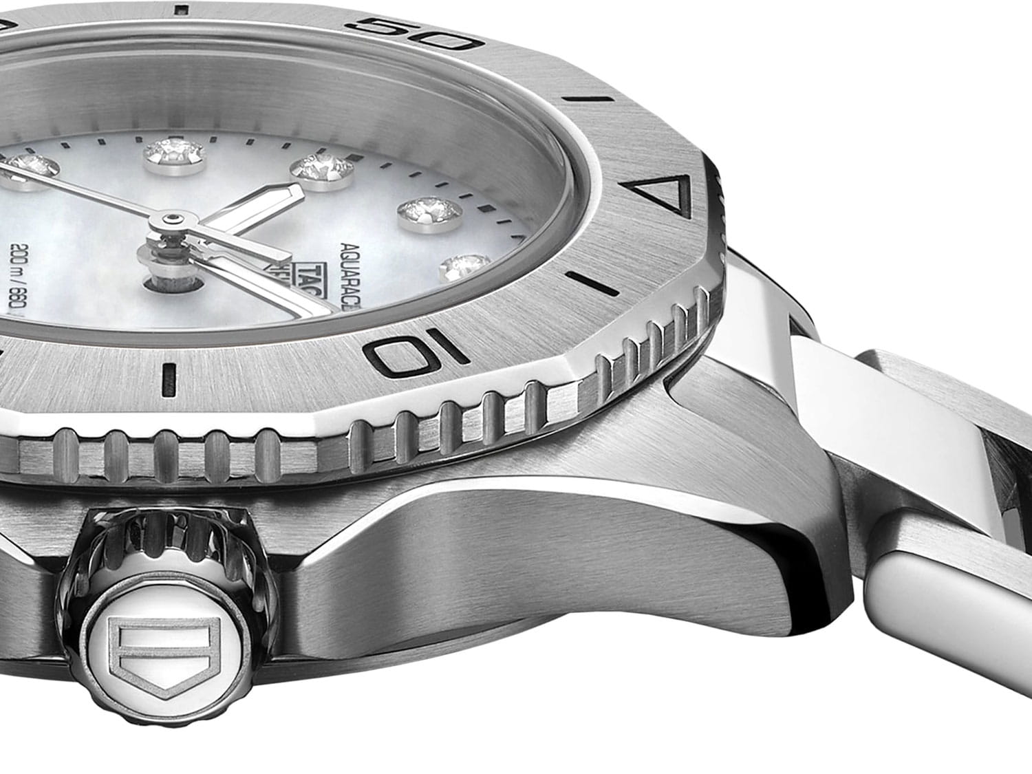 Женские швейцарские часы TAG Heuer Aquaracer Professional 200 WBP1416.BA0622, кварцевый механизм с высокой точностью. Сапфировое стеклоСапфировое стеклоПрочный и надёжный материал из кристалла сапфира синтетического происхождения, характеризующийся особой твёрдостью и устойчивостью к царапинам и повреждениям. устойчивое к появлению царапин, обладающее высокой прозрачностью. Класс водозащиты: 200 метров, позволит плавать, нырять и заниматься другими водными видами спорта. Корпус часов изготовлен из стали. Стальной браслет на раскладной застёжкеРаскладная застёжкаТакой тип застёжки используется только на браслетах из металла. Она никогда не раскрывается полностью, происходит разделение на 2 и более частей. Раскладывающая застёжка снизит вероятность потери часов к минимуму.. Стальной рифленый вращающийся 12-гранный безельБезельВнешний ободок, закрепляющий стекло. В спортивных часах так называется поворотное кольцо с делениями на циферблате, выполняет роль таймера – замеряет отрезки времени на шкале. Неподвижный безель – элемент декора. Однонаправленно вращающийся безель на дайверских часах позволяет фиксировать моменты погружения и выныривания на поверхность. с минутной шкалой выполнен с радиальным сатинированием поверхности. Перламутровый циферблат украшен 12-ю бриллиантами. Метки в виде штрихов. Стрелки и метки с родиевым и люминесцентным покрытиемЛюминесцентное покрытиеПозволяет считывать показания времени в темноте. Производители наносят на стрелки, часовые индексы, безель или поверхность циферблата светонакопительный состав, дающий холодное свечение. Superluminova. Рифленая заводная головка с защитой. Задняя крышка украшена выгравированной 8-лучевой розой ветров на фоне узора сотовой структуры.