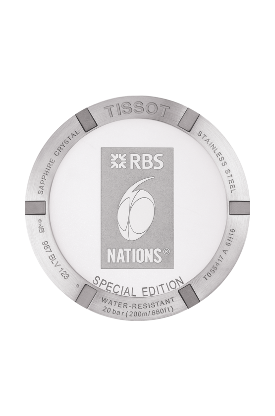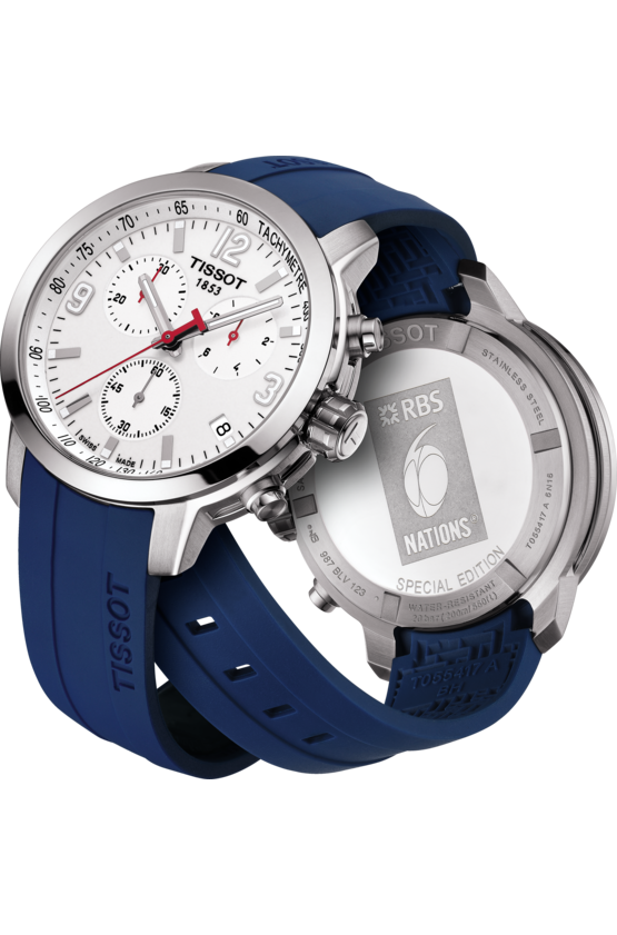 Благодаря спортивному дизайну модель Tissot PRC 200 RBS 6 Nations великолепно отражает энергию и страсть к спорту, присущие бренду и участникам чемпионата Красные стрелки подчеркивают динамичный и спортивный характер часов, а также напоминают о силе воли и активной позиции Подобно игрокам, часы, как указывает их название, являются синонимом точности, надежности и классического стиля Всем известно, что регби — спорт истинных джентльменов Синий каучуковый ремешок модели обеспечивает непревзойденный комфорт, а кроме того соответствует цветам турнира
