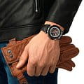 Аксессуар Limited Edition стал отражением скоростной стилистики. Динамичное оформление с мотогоночным дизайном позволит выгодно подчеркнуть повседневный образ. Массивный безельБезельВнешний ободок, закрепляющий стекло. В спортивных часах так называется поворотное кольцо с делениями на циферблате, выполняет роль таймера – замеряет отрезки времени на шкале. Неподвижный безель – элемент декора. Однонаправленно вращающийся безель на дайверских часах позволяет фиксировать моменты погружения и выныривания на поверхность. стилизован под шину мотоцикла, фактурный циферблат с красными акцентами добавляет спортивности. Задняя крышка дополнена узнаваемой гравировкой. Часы – чемпионы не только на трассе, но и в измерении времени. Высокую точность хода обеспечивает швейцарский кварцевый калибр ETA G10.212. Стекло из сапфира с покрытием "антиблик". Перфорированный каучуковый ремешок с кожаной текстурой. Люминесцентная подсветкаЛюминесцентное покрытиеПозволяет считывать показания времени в темноте. Производители наносят на стрелки, часовые индексы, безель или поверхность циферблата светонакопительный состав, дающий холодное свечение.. Корпус из стали 316L с черным PVD-покрытиемPVDУльтратонкое покрытие наносится в технике вакуумного напыления, сочетает в себе нитрид титана особой прочности со слоем золота или оксида хрома. Несёт в себе декоративную или защитную функцию.. Водостойкость 100 метров. Секундомер, тахиметрТахиметрРазмеченная шкала, располагается на ободке или безеле часов. Тахиметр позволяет рассчитать скорость на определённом участке пути, расстояние измеряется в километрах или милях., индикация числа, хронографХронографФункция позволяет измерять отрезки времени с особой точностью: часы, минуты, секунды. Верным признаком хронографа является наличие на циферблате 3 дополнительных окошек-счётчиков.. Габариты: 47,6 x 43 x 12,71 мм.