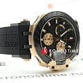 Внешний облик модели был вдохновлён лучшими гоночными мотоциклами. Массивный корпус имеет крупные детали, на чёрном циферблате чётко выделяются золотистые счётчики хронографаХронографФункция позволяет измерять отрезки времени с особой точностью: часы, минуты, секунды. Верным признаком хронографа является наличие на циферблате 3 дополнительных окошек-счётчиков., стрелки и метки с люминесцентным покрытиемЛюминесцентное покрытиеПозволяет считывать показания времени в темноте. Производители наносят на стрелки, часовые индексы, безель или поверхность циферблата светонакопительный состав, дающий холодное свечение.. Динамичный аксессуар позволит заявить о себе в любой ситуации, эксклюзивности добавляет прозрачная задняя крышка в виде колеса. Кварцевый механизм ETA G10.212. Корпус с золотистым PVD-покрытиемPVDУльтратонкое покрытие наносится в технике вакуумного напыления, сочетает в себе нитрид титана особой прочности со слоем золота или оксида хрома. Несёт в себе декоративную или защитную функцию.. Гибкий силиконовый ремешок. Секундомер, отображение текущего числа. Габариты: 47,6 x 43 x 12,3 мм.