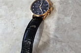 Опции хронографаХронографФункция позволяет измерять отрезки времени с особой точностью: часы, минуты, секунды. Верным признаком хронографа является наличие на циферблате 3 дополнительных окошек-счётчиков., секундомера, календаря превращают прибор для измерения времени в многофункционального помощника. Корпус увеличенного размера (45 мм) изготовлен из нержавеющей стали с золотистым PVD-покрытиемPVDУльтратонкое покрытие наносится в технике вакуумного напыления, сочетает в себе нитрид титана особой прочности со слоем золота или оксида хрома. Несёт в себе декоративную или защитную функцию., внутри находится популярный кварцевый калибр ETA G10.212. Сапфировое стеклоСапфировое стеклоПрочный и надёжный материал из кристалла сапфира синтетического происхождения, характеризующийся особой твёрдостью и устойчивостью к царапинам и повреждениям. устойчиво к появлению царапин. Водонепроницаемость 100 метров. Габариты: 45 x 45 x 11 мм.