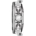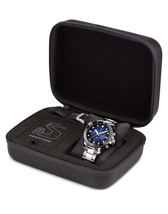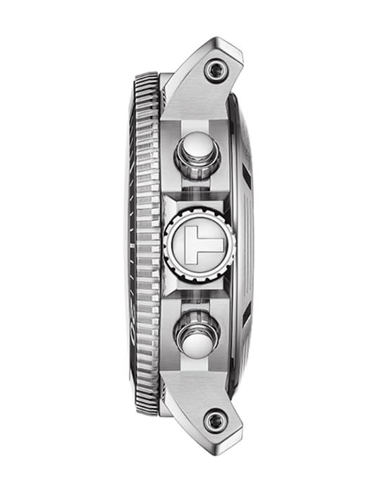 Градиентный синий циферблат имеет метки и стрелки, дополненные люминесцентным покрытиемЛюминесцентное покрытиеПозволяет считывать показания времени в темноте. Производители наносят на стрелки, часовые индексы, безель или поверхность циферблата светонакопительный состав, дающий холодное свечение.. Поворотный керамический безельБезельВнешний ободок, закрепляющий стекло. В спортивных часах так называется поворотное кольцо с делениями на циферблате, выполняет роль таймера – замеряет отрезки времени на шкале. Неподвижный безель – элемент декора. Однонаправленно вращающийся безель на дайверских часах позволяет фиксировать моменты погружения и выныривания на поверхность. защищён от царапин. Модель отличается повышенной водостойкостью в 30 бар. Заводная головка около позиции 10 часов имеет гелиевый клапан для отвода газа – запатентованное изобретение Tissot. Часы комплектуются швейцарским высококлассным и надежным механизмом хронографом с автоподзаводом и изысканным декором ETA Valjoux A05.H21ValjouxПремиальный калибр от швейцарской компании ETA c уникальной отделкой механизма. Отличается увеличенным запасом хода от 45 до 60 часов, в зависимости от калибра, точность хода составляет +/- 5 секунд в сутки. с запасом хода на 60 часов. Функции: хронографХронографФункция позволяет измерять отрезки времени с особой точностью: часы, минуты, секунды. Верным признаком хронографа является наличие на циферблате 3 дополнительных окошек-счётчиков., секундомер, календарь. Модель поставляется в оригинальном кейсе с дополнительным каучуковым ремешком.