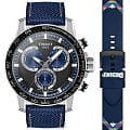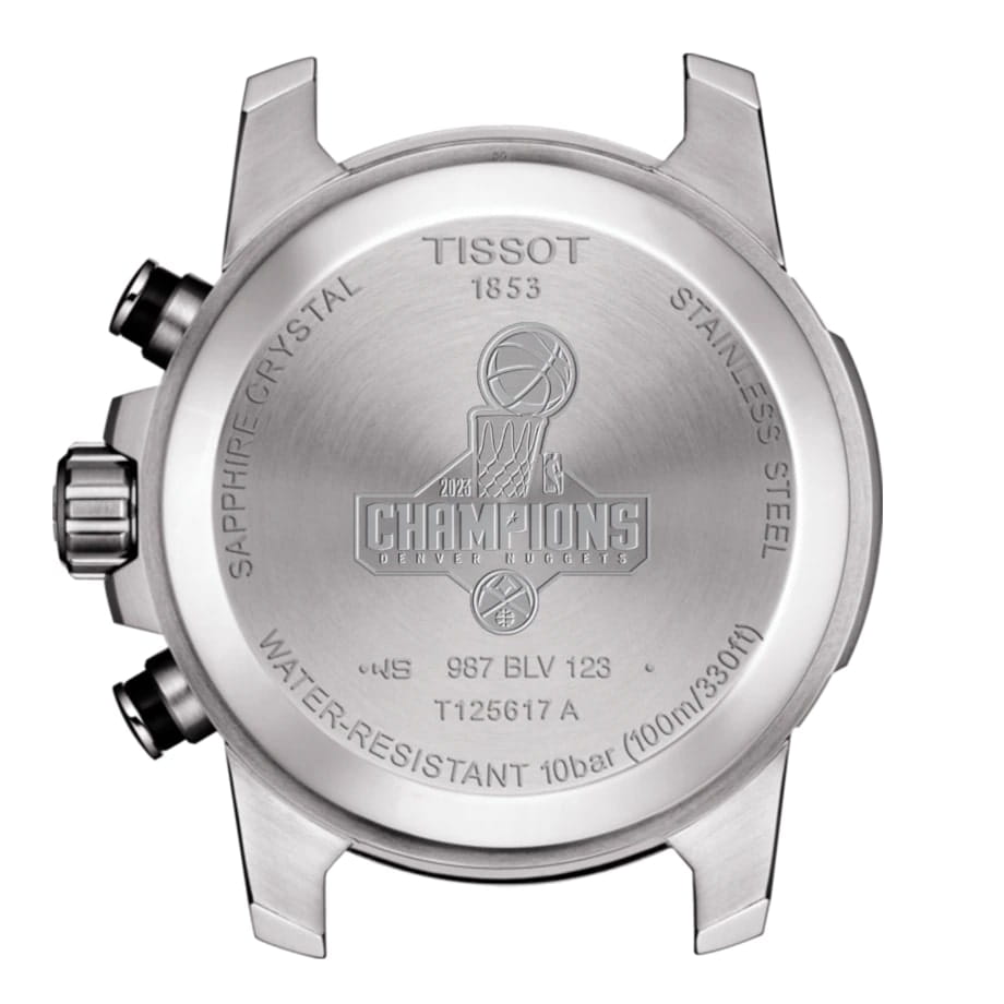 Tissot отмечает чемпионство НБА выпуском часов Denver Nuggets 2023 NBA Champions Supersport Chrono. Эти часы — квинтэссенция современной спортивности: большой хронограф (45,5 мм) с кварцевым механизмом и внушительные индексы обеспечивают лучшую видимость времени и придают глубину циферблату. Эти часы, выпущенные ограниченным тиражом, имеют заднюю крышку с гравировкой и дополнительный кожаный ремешок Denver Nuggets в память о чемпионах НБА 2023 года и их выступлениях на площадке. Массивный циферблат с крупной индикацией времени, симметричным расположением окошек – важная деталь для делового мужчины, привыкшего всё делать вовремя. Швейцарский кварцевый механизм. Сапфировое стеклоСапфировое стеклоПрочный и надёжный материал из кристалла сапфира синтетического происхождения, характеризующийся особой твёрдостью и устойчивостью к царапинам и повреждениям.. Корпус из нержавеющей стали 316L. БезельБезельВнешний ободок, закрепляющий стекло. В спортивных часах так называется поворотное кольцо с делениями на циферблате, выполняет роль таймера – замеряет отрезки времени на шкале. Неподвижный безель – элемент декора. Однонаправленно вращающийся безель на дайверских часах позволяет фиксировать моменты погружения и выныривания на поверхность. размечен шкалой тахиметраТахиметрРазмеченная шкала, располагается на ободке или безеле часов. Тахиметр позволяет рассчитать скорость на определённом участке пути, расстояние измеряется в километрах или милях.. Водонепроницаемость до 10 бар. Люминесцентная подсветкаЛюминесцентное покрытиеПозволяет считывать показания времени в темноте. Производители наносят на стрелки, часовые индексы, безель или поверхность циферблата светонакопительный состав, дающий холодное свечение.. СекундомерСекундомерСекундоме́р — прибор, способный измерять интервалы времени с точностью до долей секунды., хронографХронографФункция позволяет измерять отрезки времени с особой точностью: часы, минуты, секунды. Верным признаком хронографа является наличие на циферблате 3 дополнительных окошек-счётчиков., индикация числа. Длина и ширина корпуса: 45,5 мм.