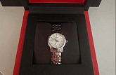 Модель представлена в минималистичном исполнении. Точность хода швейцарского кварцевого механизма ETA F04.115 составляет +/- 20 секунд в месяц. Сапфировое стеклоСапфировое стеклоПрочный и надёжный материал из кристалла сапфира синтетического происхождения, характеризующийся особой твёрдостью и устойчивостью к царапинам и повреждениям. устойчиво к появлению царапин. Корпус и браслет изготовлены из нержавеющей стали 316L. Часы сохраняют водостойкость при давлении 5 бар. Застёжка «бабочка» с кнопкамиЗастёжка "бабочка"Такой вид застёжки дополняется предохранителями, помогающими избежать случайного раскрытия браслета. Обладают изящным исполнением. никогда не расстегнётся случайным образом. Функции: календарь, EOLEOLПредставляет собой систему, уведомляющую владельца часов о необходимости замены элемента питания. За 2 недели до полного разряда батарейки секундная стрелка перестаёт ходить чётко и начинает перепрыгивать на 3-4 деления..