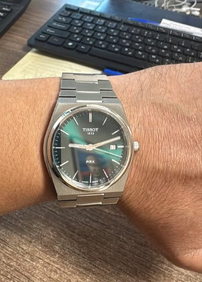 Tissot PRX 40mm (модель T137.410.11.091.00) – элегантные мужские часы, сочетающие современный стиль с передовыми технологиями. Корпус диаметром 40 мм выполнен из нержавеющей стали 316L, что обеспечивает надёжность и долговечность. Зелёный циферблат с эффектом солнечных лучей защищён сапфировым стекломСапфировое стеклоПрочный и надёжный материал из кристалла сапфира синтетического происхождения, характеризующийся особой твёрдостью и устойчивостью к царапинам и повреждениям., устойчивым к царапинам.
