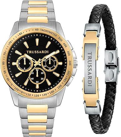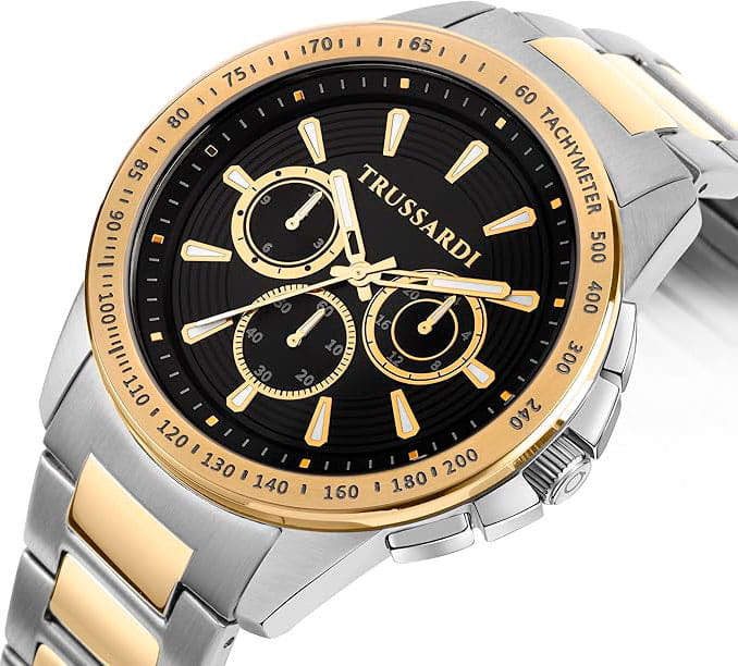 Итальянские мужские часы Trussardi T-Hawk R2453153001 - это стильный мужской аксессуар, который сочетает элегантный дизайн и практичность. Корпус выполнен из нержавеющей стали с безелемБезельВнешний ободок, закрепляющий стекло. В спортивных часах так называется поворотное кольцо с делениями на циферблате, выполняет роль таймера – замеряет отрезки времени на шкале. Неподвижный безель – элемент декора. Однонаправленно вращающийся безель на дайверских часах позволяет фиксировать моменты погружения и выныривания на поверхность. с IP-покрытиемIP-покрытиеМетод ионного напыления. Демонстрирует повышенную устойчивость к истиранию, окислению и химическим веществам. Под воздействием высокого давления и температуры около 1500°C молекулы металла надёжно соединяются с частицами корпуса часов., что обеспечивает долговечность и утончённый внешний вид. Шкала тахиметраТахиметрРазмеченная шкала, располагается на ободке или безеле часов. Тахиметр позволяет рассчитать скорость на определённом участке пути, расстояние измеряется в километрах или милях. на безелеБезельВнешний ободок, закрепляющий стекло. В спортивных часах так называется поворотное кольцо с делениями на циферблате, выполняет роль таймера – замеряет отрезки времени на шкале. Неподвижный безель – элемент декора. Однонаправленно вращающийся безель на дайверских часах позволяет фиксировать моменты погружения и выныривания на поверхность.. Надежное минеральное стеклоМинеральное стеклоМинеральное стекло представляет собой искусственно выращенный минерал кварца. Такое стекло отличается особой устойчивостью к повреждениям и царапинам. Уступает по некоторым качествам сапфировому стеклу. защищает циферблат от царапин и обеспечивает долговечность. Модель оснащена кварцевым механизмом, обеспечивающим высокую точность хода. Браслет из нержавеющей стали с частичяным IP-покрытиемIP-покрытиеМетод ионного напыления. Демонстрирует повышенную устойчивость к истиранию, окислению и химическим веществам. Под воздействием высокого давления и температуры около 1500°C молекулы металла надёжно соединяются с частицами корпуса часов. с раскладной застёжкойРаскладная застёжкаТакой тип застёжки используется только на браслетах из металла. Она никогда не раскрывается полностью, происходит разделение на 2 и более частей. Раскладывающая застёжка снизит вероятность потери часов к минимуму. обеспечивает комфортное ношение. Водозащита 50 метров позволит защитить корпус от случайных брызг или капель дождя. Вынесенный циферблат с 24-х и 12- ти часовым указателем времени, а также вынесенный циферблат с хронографомХронографФункция позволяет измерять отрезки времени с особой точностью: часы, минуты, секунды. Верным признаком хронографа является наличие на циферблате 3 дополнительных окошек-счётчиков.. Стрелки и метки оснащены люминесцентным покрытиемЛюминесцентное покрытиеПозволяет считывать показания времени в темноте. Производители наносят на стрелки, часовые индексы, безель или поверхность циферблата светонакопительный состав, дающий холодное свечение., обеспечивающим отличную видимость даже при слабом освещении. Эта модель – отличный выбор для тех, кто ищет сочетание стиля, качества и функциональности. Часы станут не только полезным аксессуаром, но и выразительным элементом вашего и