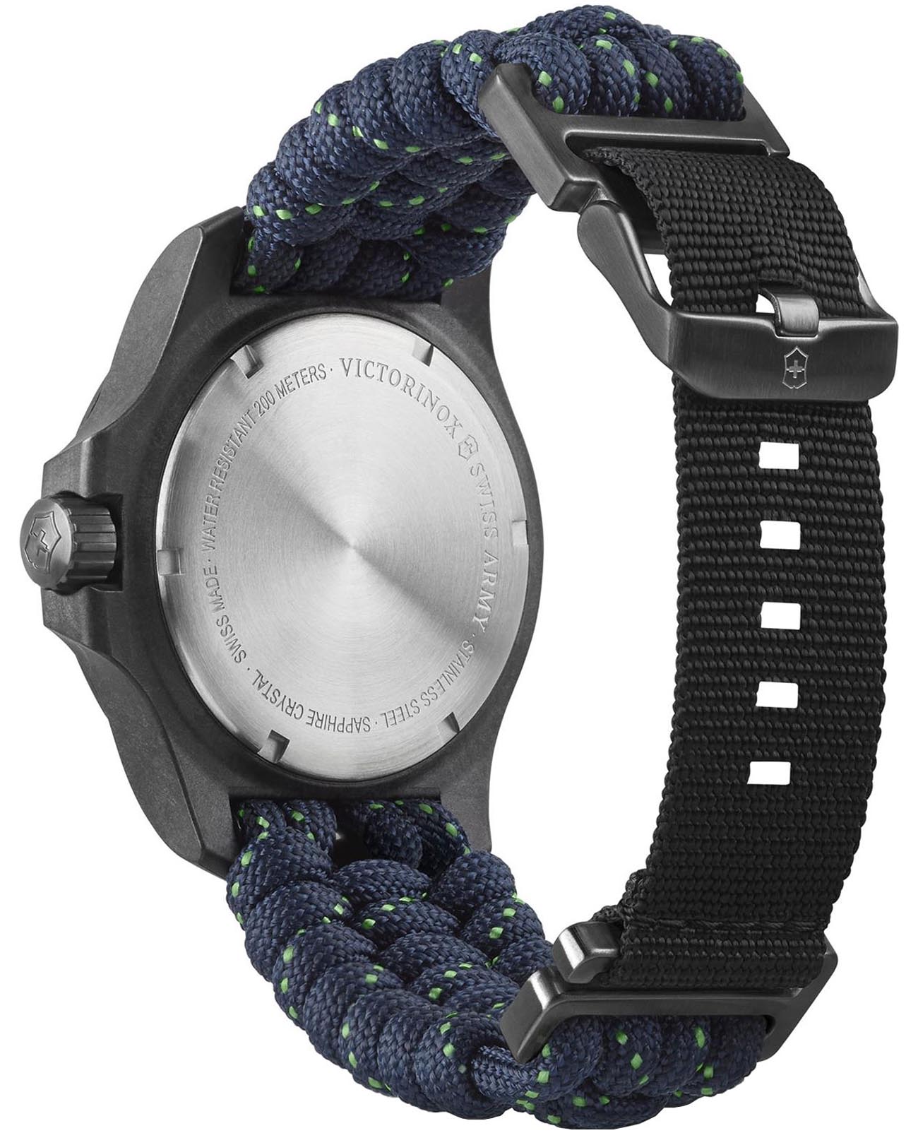 Мужские швейцарские часы Victorinox I.N.O.X. Carbon 241860. Сапфировое стеклоСапфировое стеклоПрочный и надёжный материал из кристалла сапфира синтетического происхождения, характеризующийся особой твёрдостью и устойчивостью к царапинам и повреждениям. с трёхслойным антибликовым покрытием. Корпус часов выполнен из карбона. Ремешок изготовлен из плетенной паракордовой стропы, длиной 2,5 метра и способной выдержать 250 кг. Влагозащита: 200 метров, позволит плавать, нырять и заниматься другими водными видами спорта. Окошко даты находится в положении между 4 и 5 часов. Стрелки и метки с люминесцентным покрытиемЛюминесцентное покрытиеПозволяет считывать показания времени в темноте. Производители наносят на стрелки, часовые индексы, безель или поверхность циферблата светонакопительный состав, дающий холодное свечение.. В комплект часов входят съемный защитный бампер и сменный каучуковый ремешок!