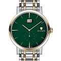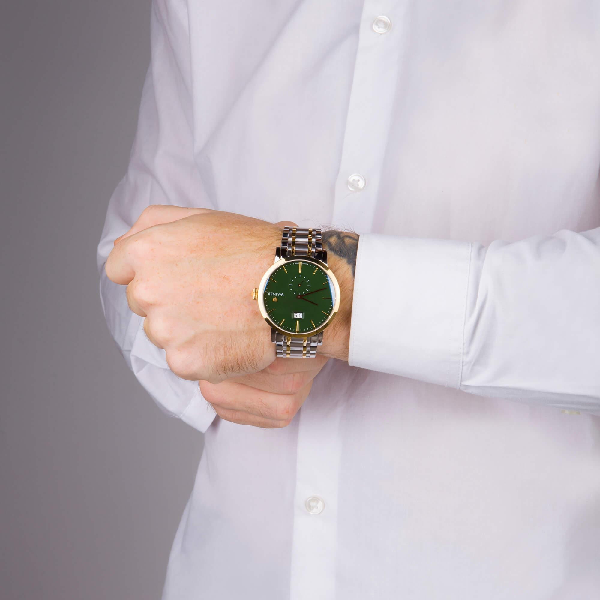 Мужские кварцевые часы. Калибр механизма Ronda 6004.B. Центральные часовая и минутная стрелки, секундная стрелка вынесена на малый циферблат. Большая дата в позиции 12 часов. Зеленый циферблат. Круглый корпус выполнен из нержавеющей стали 316L. Диаметр корпуса составляет 44 мм, толщина 10 мм. Стальной браслет с частичным PVD-покрытиемPVDУльтратонкое покрытие наносится в технике вакуумного напыления, сочетает в себе нитрид титана особой прочности со слоем золота или оксида хрома. Несёт в себе декоративную или защитную функцию., раскладная застёжкаРаскладная застёжкаТакой тип застёжки используется только на браслетах из металла. Она никогда не раскрывается полностью, происходит разделение на 2 и более частей. Раскладывающая застёжка снизит вероятность потери часов к минимуму.. Устойчивое к возникновению царапин сапфировое стеклоСапфировое стеклоПрочный и надёжный материал из кристалла сапфира синтетического происхождения, характеризующийся особой твёрдостью и устойчивостью к царапинам и повреждениям.. Водостойкость -- 50 метров, позволит защитить корпус от случайных брызг или капель дождя. Вес примерно 150 г.