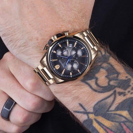 Швейцарские мужские кварцевые часы-хронограф Wainer WA.16100-D с механизмом калибра Ronda 5030.D станут идеальным выбором для ценителей стильных и практичных аксессуаров. Корпус из нержавеющей стали 316L с частичным PVD-покрытиемPVDУльтратонкое покрытие наносится в технике вакуумного напыления, сочетает в себе нитрид титана особой прочности со слоем золота или оксида хрома. Несёт в себе декоративную или защитную функцию. диаметром 44 мм и толщиной 11 мм защищен прочным сапфировым стекломСапфировое стеклоПрочный и надёжный материал из кристалла сапфира синтетического происхождения, характеризующийся особой твёрдостью и устойчивостью к царапинам и повреждениям., устойчивым к царапинам и механическим повреждениям. Циферблат с метками в виде штрихов оснащен окошком даты между 4 и 5 часами, а указатель дня недели вынесен на отдельный циферблат. Рифленая заводная головка с защитой обеспечивает дополнительную надежность механизма. Модель имеет класс водозащиты 100 метров, позволит плавать, нырять и заниматься другими водными видами спорта. Часы комплектуются стальным браслетом из нержавеющей стали 316L на раскладной застёжкеРаскладная застёжкаТакой тип застёжки используется только на браслетах из металла. Она никогда не раскрывается полностью, происходит разделение на 2 и более частей. Раскладывающая застёжка снизит вероятность потери часов к минимуму.. Функциональные возможности включают хронограф, секундомер и вынесенную секундную стрелку. Модель станет превосходным выбором для мужчин, ценящих надежность швейцарского качества и современный дизайн.