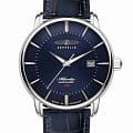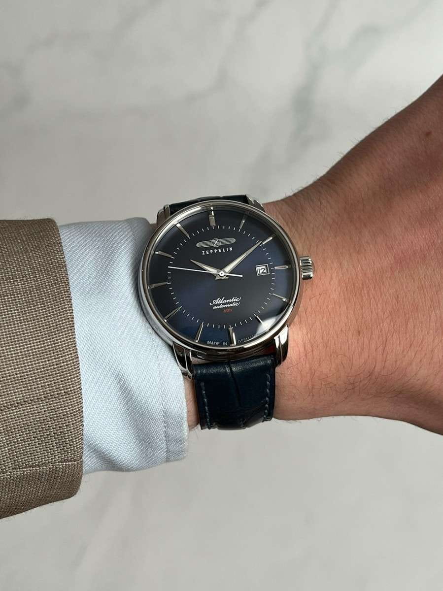 Часы Zeppelin 8460-3 — это изделие, которое идеально сидит на мужском запястье. Уникальный циферблат модели темно-синего цвета отличается светящимися стрелками и индексами благодаря люминесцентному покрытиюЛюминесцентное покрытиеПозволяет считывать показания времени в темноте. Производители наносят на стрелки, часовые индексы, безель или поверхность циферблата светонакопительный состав, дающий холодное свечение. и покрыт закаленным минеральным стекломМинеральное стеклоМинеральное стекло представляет собой искусственно выращенный минерал кварца. Такое стекло отличается особой устойчивостью к повреждениям и царапинам. Уступает по некоторым качествам сапфировому стеклу.. Корпус из полированной стали крепится к классическому синему кожаному ремешку. Дополнительной функцией часов является отображение дня месяца в положении "3 часа". Водонепроницаемость до 50 метров обеспечивает защиту от возможных брызг. Эти часы подойдут для повседневного ношения и станут ярким акцентом в вашем наряде.